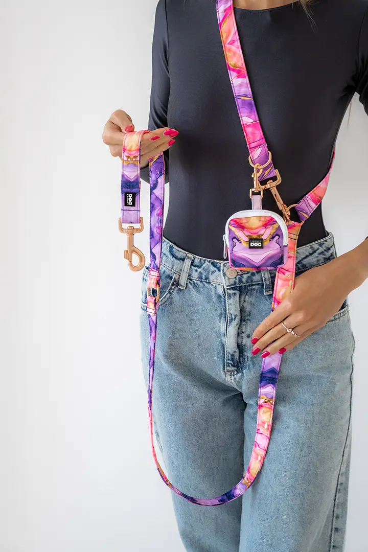 Elegance je kombinací fialových a růžových barev, která uchvátí hlavně psí slečny. Díky výrazným barvám budete k nepřehlédnutí. Vzor je doplněný kovovými přezkami v barvě rose gold.